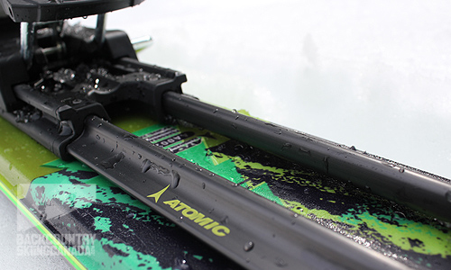 The entire lockdown system of the Atomic Tacker 16s is traditional in the sense that your boot goes in, the back lever pops up and it’s locked. To release the boot from the binding, you just press down on the back lever and pull your boot out. Where this binding differs from others, however, is how you access the touring mode. As mentioned above, there is a small plastic slide lever at the back of the binding that you press and push toward the rear of the ski with the end of your ski pole. This releases hooks underfoot and the binding has a full range of movement to allow you to skin up. (In fact, the toe hinge has a full 90-degree pivot for optimal climbing and kick-turn capability.) On most days this system works but, again, the first time I tried the Trackers the conditions was heavy and damp and I found I had to use the tip of my pole to scrape out the snow that had gotten packed into the metal clips. But, to be fair, on that particular day you’d probably find that with most backcountry binding systems.