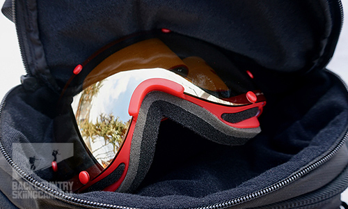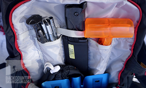 The avalanche tool compartment has a separate bright red double zipper and stores the standard compliment.