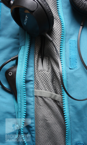 There is a big hood with multiple adjustments, zippered pass pocket on the forearm, headphone/music compartment, mesh goggle pocket, two-way zippers at the underarm vents, and some awesome double wrist gaiters. I say awesome because these little pieces of fabric do wonders for keeping the snow out of your jacket. They also keep your hards warm when you have your mitts off to take a photo or have a snack. Adjustable cuffs, drawcord system at the waist, fully sealed seams, and detachable powder skirt round out the feature list.