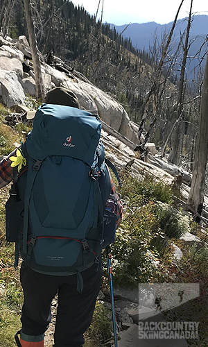 Here, below, is the men's version: the Deuter Futura Vario 50 + 10. The nifty hiking pole attachment is fully deployed on a recent hike up to Silver Spray Cabin here in the Kootenays. For the full review, be sure to click on the little arrow on the left side of the yellow bar below this photo.