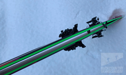 Elan uses a poplar and paulownia wood core in the Tour 104 Skis to ensure they are lightweight. Over this, they longitudinal embed a single carbon rod into the middle of the core to provide stability, dampening, and vibration absorption through the ski. Elan calls this their Carbon Bridge Technology and you can see this rod half-embedded into the core at the tips and tails, underfoot the core thickens and this carbon rod goes more directly through the core itself.