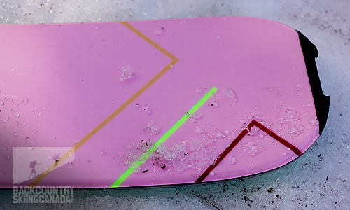 The tip and tail closeup below shows off the skin clip integrated into the tail of the Agent 2.0X Skis as well as the generous rocker in the tip.