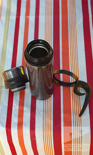Backcountry application: Fill it up as a mug in the morning, once you are ready to start skinning up, lose the handle and toss it in you pack. (Warning: it is under half a litre, so if you are going to need more than two cups of coffee it is not the answer).