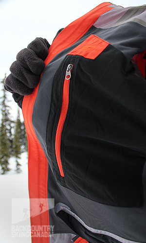The big feature of the Alakazam is its “Zonal construction” or “body mapping design” as some call it. Essentially it is the combination of hard and soft shell fabric in the optimal locations to provide better breathability and mobility. An example of this is the use of hard shell material on the shoulders, hood and arm cuffs where snow and moisture collect. Soft shell fabric is used under arms and wraps from the chest around to the back where you want additional breathability and flex. These soft shell panels allow for a bit of stretch for those long reaches while skinning up especially at the elbows. This all sounds ideal for backcountry enthusiasts however it all ads up to a 794g jacket that amounts to a lot when not in use. True you can remove the powder skirt to lighten the load but it needs more than that to be a true backcountry offering. Check out the Mountain hardwear Drystien jacket review for a lighter hardshell option.