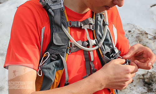 The number of buckles, bungees, and metres of webbing put into this vest is slightly mind-boggling. While this may deter some users, the fit system works very, very well. 2L of water, a passel of gels, granola bars and electrolytes, a rain jacket, camera, and a cellphone are all swallowed easily by the VaporWrap, disappearing as if into a void unaffected by gravity. Bounce is negligible, even on the most technical of descents, and leaves the user comfortable without having to worry about regular hydration.