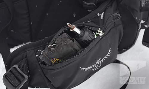 A common complaint with Osprey bags is that sometimes buckles must be undone in order to completely open zippers. It’s a small matter of convenience to avoid the buckle access situation, but I have to admit that the advantages that are offered under the current configuration seem like a reasonable trade-off. As the zipper covers 3 sides (2 sides with the avalanche pocket), the buckles need to cross zippers in order to achieve functional compression. In my opinion, quality compression is well worth the extra step to completely open and close pockets.