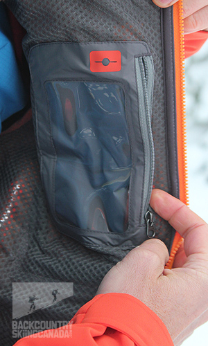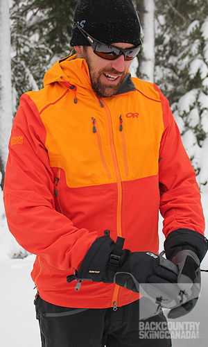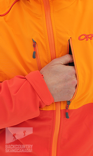 A long list of features makes the Valhalla Jacket ideal for ski touring but rather than touch on each one individually I will speak to the ones that I found to be truly unique and then simply list the rest below. First and foremost, the Gore Windstopper X-Fast Soft Shell fabric is extremely stretchy and thus provides a large range of motion and great fit. The fabric face is soft to the touch and allows excess heat to escape while keeping out wind and moisture. The jacket’s mesh lining allows any one of the four external pockets to act as vents: two harness and pack compatible hand warmer pockets and two Napoleon pockets. If additional venting is desired, the pit zips can be opened all the way to the hem in OR’s unique Torsoflow design. Snaps located directly beside the hem adjustments keep the jacket cinched to your waist when you have these huge vents maxed out. In addition, two interior zippered pockets provide unique features for both MP3 players and additional venting. On the right is a mesh pocket with access from the exterior Napoleon pocket while on the left is an MP3 pocket complete with ear phone pass through and clear window display.