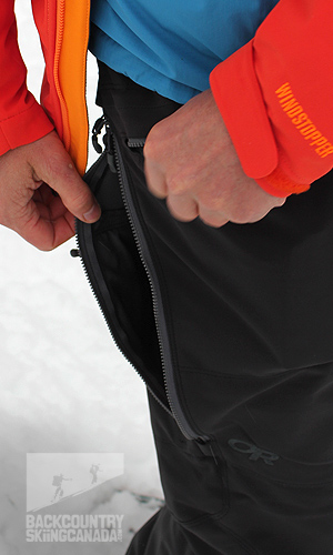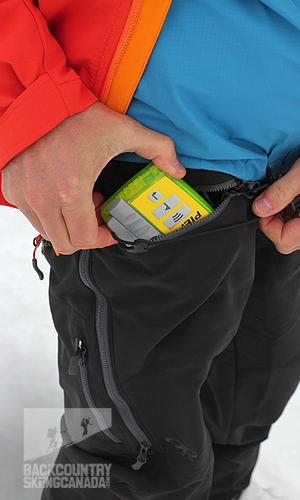 In keeping with the venting options on the Valhalla Jacket the pants offer two massive thigh vents with double action zips. The Gore Windstopper X-Fast Soft Shell fabric is plenty breathable, however, if you have to dump large amounts of heat these thigh vents get the job done lickety-split. There are also five pockets on the Valhalla Pants but unfortunately only the back butt pocket offers a mesh lining for further venting. Two side thigh pockets, two hand warmer pockets and one rear pocket provide ample storage for small items. The right hand warmer pocket has a built in secondary interior pocket with a beefy clip to accommodate your transceiver should you prefer this carrying method over the standard chest harness method.