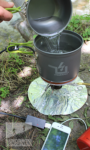 As the pot begins to heat the contents inside, your electronic device will begin to charge. Once the water is in full boil the electronic output won’t be as strong. “Amp it up” by adding more cool water or snow.