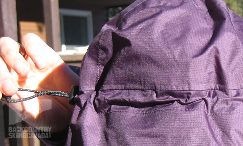 The drawstrings on the hood are the one area that needs improvement on the Snowpack Jacket. Specifically, the drawstrings constantly poke out and make it difficult to do the zipper up all the way. Although the drawstring feeds under the fleece lining inside the collar, too much of the drawstring sticks out past the fleece. In contrast, on the Microlight the drawstrings are kept out of the way with a fabric tunnel.