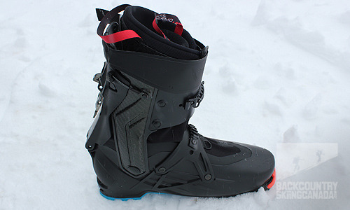 The real story with the S-Lab X-Alp Boots is the 3D rotating carbon cuff with 23 degrees internal and 12 degrees external lateral motion, allowing for ankle mobility and better ergonomics when skinning in steep off-camber or side hill terrain. With cuff rotation that’s off the charts and more degres than what my ankle is capable of flexing, you know this boot will climb like nothing else. Without a tongue, the design allows for complete freedom when you walk. The sensifit shell has a fairly thin wall with strategically placed reinforcement to makes the boots stiff, yet still light. This enhanced shell thickness is found around the cuff pivot to reduce the shell’s tendency to bulge as it flexes and help it ski stronger.