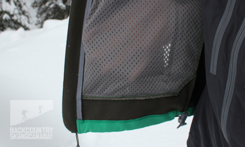 The jacket is not a technical piece designed for ski-touring or other high-output activities in the mountains. The Sphero XT fabric is comfortable but does not breathe enough for high output activities. The bottom two pockets are obstructed by the hip-belt of a backpack. The hood only has one adjustment on the back for volume, and does not have great articulation.