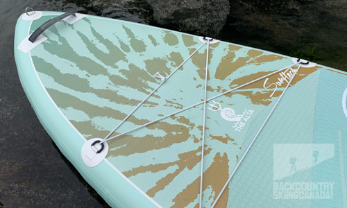 While the Alta Air Travel SUP is designed for women—given its length, shape and graphic treatment, I found it to be an ideal SUP for paddling on the lake and taking on smaller creeks and rivers. The ability to remove the centre fin makes the board very versatile and allows it to go from tracking really well on flat water to being very manoeuvrable on moving water no matter how shallow. It's a great platform to explore those hard-to-reach waterways, especially since it is so stable. The 6” thickness ensures that the Alta Air Travel SUP is rigid and its 32" width means that it's stable, even for beginners. The Alta's shorter 10’2” length makes it easy to move around on the board so you can easily shift your weight to the back of the board to easily get the nose out of the water and turn it on a dime as you can see in the video above. The board’s overall shape makes it more stable than fast on the water which means that it’s also pretty fun to just play around on.