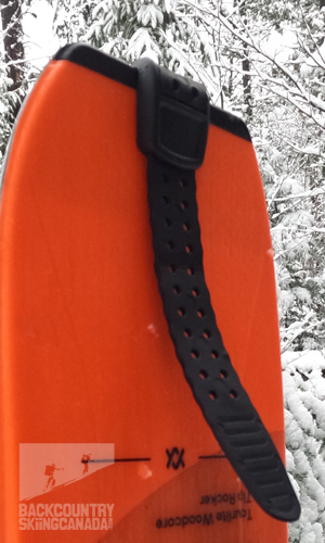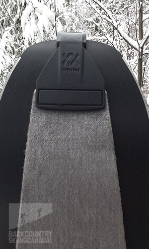 Volkl has a new skin attachment design for their Rise touring skis which is a departure from the brand's SkinPin system found on their BMT and Mantra touring skis. While those skis have a physical hole in the tip of the skis to accommodate Volkl skins, the Rise skis use a more sublet depression or notch in the tips and tails. Volkl of course makes pre-cut skins for all the Rise skis and they use a standardized adjustable rubber tail strap and clip design. On the tips, these Volkl skis use an elastic snap hook so you can now strip your skins by pulling the tail or tip clips off the skis. They are of course glove-friendly and the Smart Skinclip attachment system on the skis is fully compatible with both Fibre Tech and Smart Glue skins.