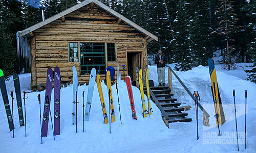 The Woody Creek Cabin, pictured below, sleeps up to ten people and is an open concept, very comfortable spot. The skin-in is a little more than 4 kilometres (2.5 miles) in, and features a pretty mellow grade. Some in our party pulled sleds with extra luxury items. The cabin sits at 2650m (8,700’) at the confluence of the Woody and Hayden Creeks. Wood heat and snow melt for water.
