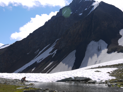 A camper gathers water from Russet Lake with Fissile looming in the background. We camped out here the night of the largest thunderstorm in the area for years. For most of the evening it was an incredible show as the storm passed to the south but just after midnight it rolled directly overhead. Scary times in the tent!
