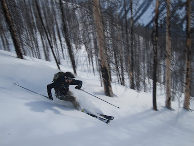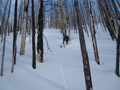After a relaxing Christmas with the family, it was time to hit Boxing Day hard. Santa delivered some of the new snow that I and many others had asked for, so my brother and I were determined to beat the rush so that we could be the first to ski that snow the next day. Our doorcrashing (trailbreaking) effort paid off as we had a 1000m descent through a burnt forest without crossing any tracks. When new growth started poking through, we could just traverse over to sample a new pitch. Scrambling over the loose scree to try to bag the summit, I got more than I bargained for, but still climbed up to a subpeak, separated from the main peak by a knifedge ridge. The climb is definitely not as trivial as either the new Summits and Icefields or Shaun King’s route description makes it out to be. Definitely not "buy one get one free".