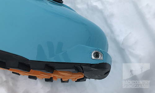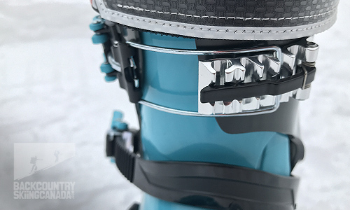 Here is the Speedlock Plus walk/ski lever. It's external so easier to maintain in the field. Our tester did comment that the bar/lever connection occasionally got clogged with snow going into ski mode. Just be sure to confirm you are in the right mode before dropping in. Try flexing the boot forward and back and listen for the little click.