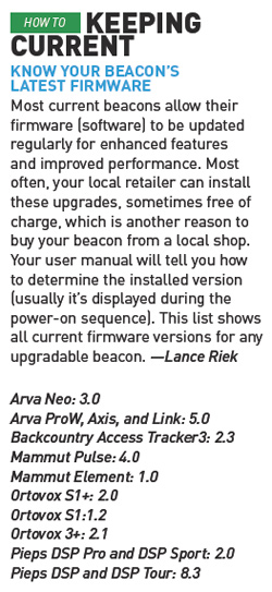 Next, check the manufacturer’s website (or the image below) for any new firmware updates that may be available, and update accordingly. If you’re unsure of what firmware your beacon currently has, consider sending it to its manufacturer for a diagnostic test. Then, ideally, run through some testing with your regular ski partners. “If you have time, put in fresh batteries and run a good diagnostic,” Jolley says. “That’s the ‘black diamond’ of storage, and just taking the batteries out is the blue square.” Make sure to test your beacon a few times in both search and transmit mode.