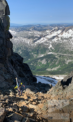 To access Kokanee Glacier most people hike into the Cabin then follow the trail to the toe of the Glacier but the faster more efficient route is to hike up the steep west-facing Keyhole trail. From car to ridge top can be achieved in 2.5 hours if you are in good shape and used to hiking with the weight of skis and boots on your pack. From here it is a short ski and then skin up to the top of Kokanee Glacier where you will be rewarded with beautiful 360° views. The descent may be short and the snow sun cupped this time of year but hey, it’s skiing in July so you shouldn’t complain. From the bottom of the glacier, you can either follow the summer trail back out to Kaslo Lake, Keen Lake, Kokanee Lake and finally Gibson Lake where the trail started from. Instead of this longer, less direct route we always opt for the shortcut over the lower shoulder of the pyramid which saves time and distance.