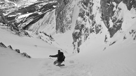 The real excitement is in the narrows for the first few hundred vertical meters. From there a gentle bowl typically offers up easy shnoodling before narrowing back down to a drainage/slide path peppered with rock outcrops and one larger cliff band. If you’re interested in carrying a rope and harness up and down the mountain you can rappel the small cliff, otherwise it can be skirted on skiers left by climbing a short distance uphill into the trees.